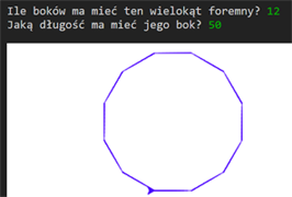 Napisz program, który narysuje wielokąt foremny, pytając wcześniej ile ma mieć boków i jaką długość ma mieć bok tego wielokąta.