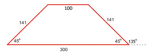 Napisz program, który narysuje pokazany trapez równoramienny (wymiary i kolory na rysunku, a grubość pisaka ustaw na 4).