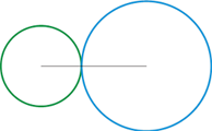 Napisz program, który narysuje dwa „dotykające się” okręgi (czyli styczne), mniejszy o promieniu 30, a większy okrąg o promieniu 50 i odcinek łączący ich środki. Kolory takie jak na rysunku, a grubość linii dowolna.