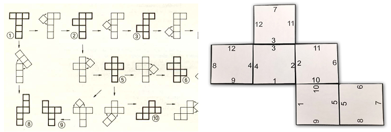 Nie ma cudownej reguły, ale są w miarę proste zasady, które pozwolą dosyć szybko ocenić czy z danej siatki wyjdzie sześcian (poniżej będą omówione i wyjaśnione). Powiedzmy jeszcze w tym miejscu o dwóch sposobach, które pozwalają z jednej siatki otrzymywać pozostałe - po lewej fragment artykułu Marka Kordosa z „Małej Delty” (1992 r.), w którym nowe siatki otrzymuje się przez obrót ścian dokoła wierzchołków (link), a po prawej jedna z układanek, gdzie najpierw na sześcianie numeruje się wszystkie krawędzie na obu sąsiadujących ścianach, a później wycina się ściany i układa jak kostki domina tworząc nowe siatki.