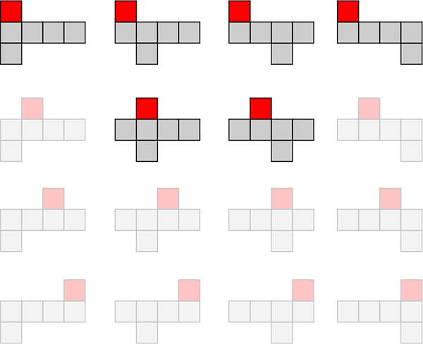 NIE MOŻE istnieć siatka, która mając 4 kwadraty w jednym pasie, pozostałe dwa ma obok siebie w innym pasie - wtedy też jedna ze ścian trafi na już zajęte miejsce.