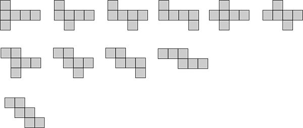 Wszystkie 11 różnych siatek sześcianu razem (kolejno po 4, 3 i 2 kwadraty w środkowym pasie).