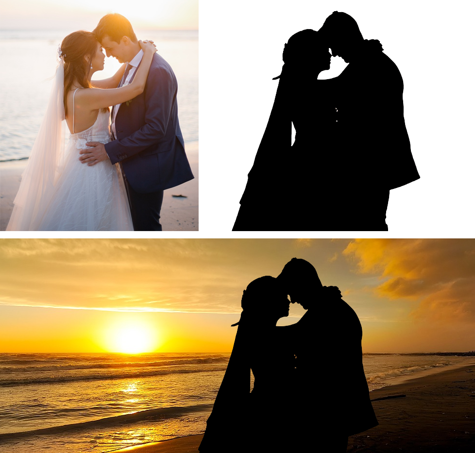 Tutaj inna technika - najpierw powstaje bardziej złożony kształt, przy czym zamiast ręcznego obrysowywania można "iść na łatwiznę" i skorzystać z gotowych narzędzi wyodrębniających kształty ze zdjęcia (w przykładzie po prawej parę młodych wycięła aplikacja na stronie www.remove.bg ).