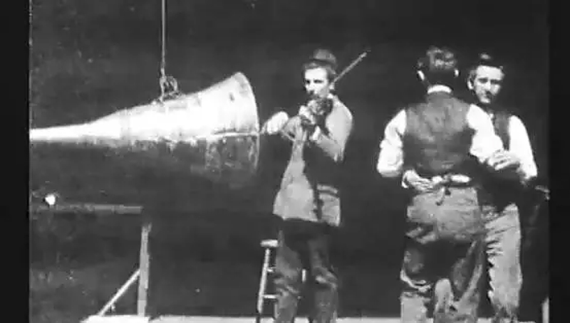 Kliknij na poniższe zdjęcie, a zobaczysz pierwszy znany film z dźwiękiem nagranym na żywo przez Dicksona w 1894 lub 1895 roku. Nie jest to film "dźwiękowy", a jedynie film z dźwiękiem, który był nagrany osobno na fonografie i na nim też był odtwarzany w czasie projekcji filmu.
