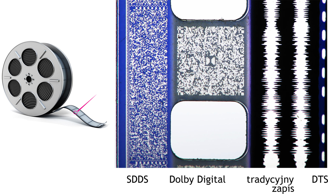 Tak jak "wszędzie", tak i do zapisu dźwięku na taśmie filmowej wkroczyła technika cyfrowa (czyli mówiąc najprościej - "komputer zapisuje i odczytuje dźwięk"). Na podanym niżej zdjęciu widać wszystkie trzy metody używane w cyfrowym zapisie dźwięku dla filmów, a najpopularniejszą z nich jest Dolby Digital, w której cyfrowy kod z zapisanym dźwiękiem umieszczony jest pomiedzy otworami trakcyjnymi taśmy filmowej.
