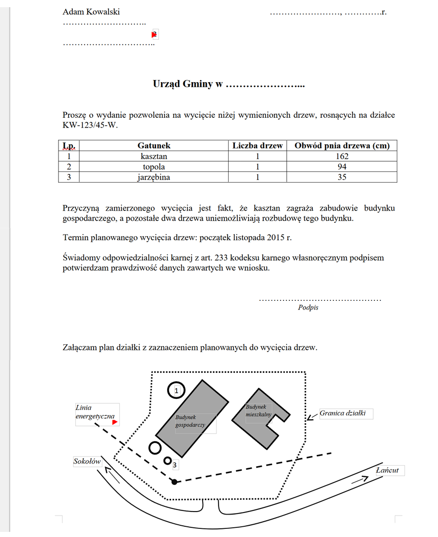 Po prawej wersja pisma z grafiką z Autokształtów, lecz może tam być np. zdjęcie z maps.google, na którym trzeba zaznaczyć dane drzewo.