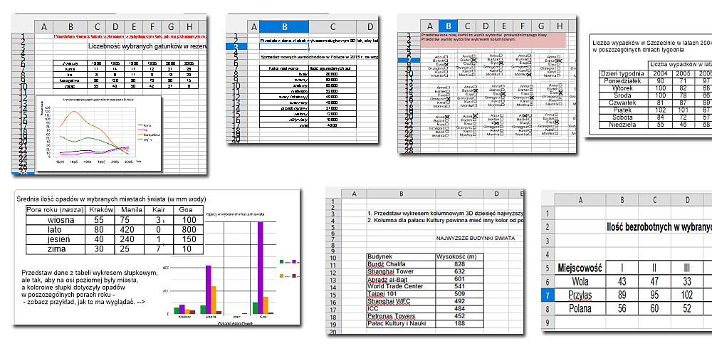 Pdf z zadaniami do utworzenia w arkuszu kalkulacyjnym tabel i wykresów.